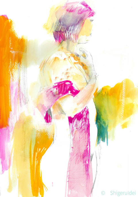 水彩画といえば、ぼかし、にじみで濃淡をつけて描くイメージだと思いますが、その手法、濃淡をどうするのかを交えつつ、私がみなさんにお伝えしたい「水彩画」を披露します。人物の形に対するアプローチの仕方、形の決め方もお伝えします。