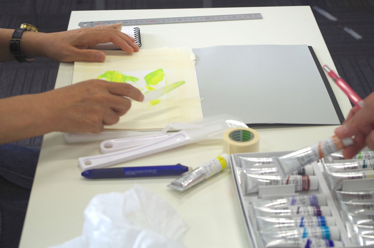 - 絞り出した絵の具をゴムベラなどで掻き伸ばす。