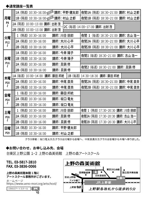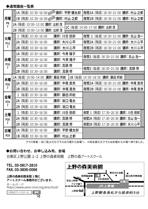 • 後期受講料にはカリキュラムの一環としてアトリエ展出品料が含まれます(ただし夜間講座および月曜2A・2Bクラスには含まれません)。未出品でも返金はできませんのであらかじめご了承ください。