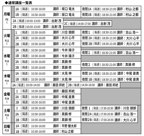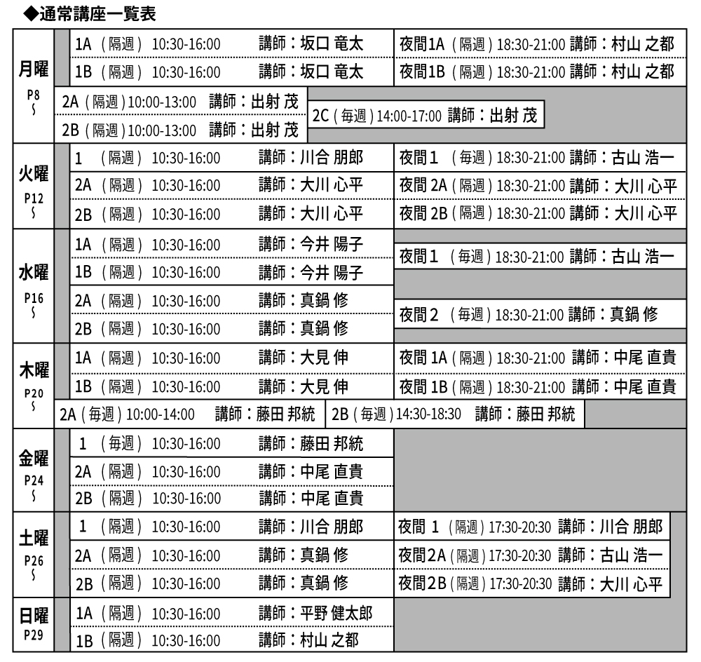 - 空席があれば期の途中から受講可能です(受講料は、日割り計算+事務手数料+施設料となります)。ただし、受講開始はお申し込みから2週間以内とさせていただきます。