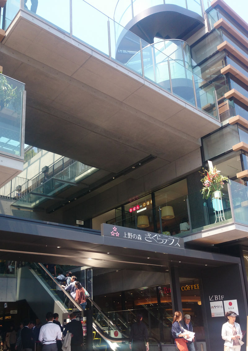 週末にオープンしたのは「上野の森さくらテラス」。きれいな外観で親しまれるテラスになりそうです。