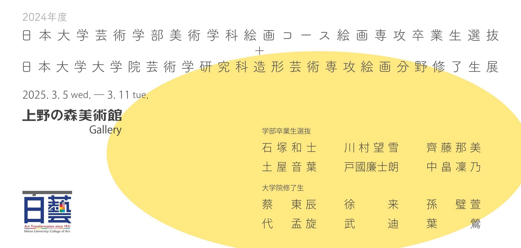 2024年度日本大学芸術学部 美術学科絵画コース絵画専攻卒業生選抜 + 日本大学大学院 芸術学研究科造形芸術専攻絵画分野修了生展Nihon University College of Art, Department of Fine Arts, Painting Course, Painting Major Graduate Selection + Nihon University Graduate School of Art, Department of Fine Arts, Painting Department Alumni Exhibition.