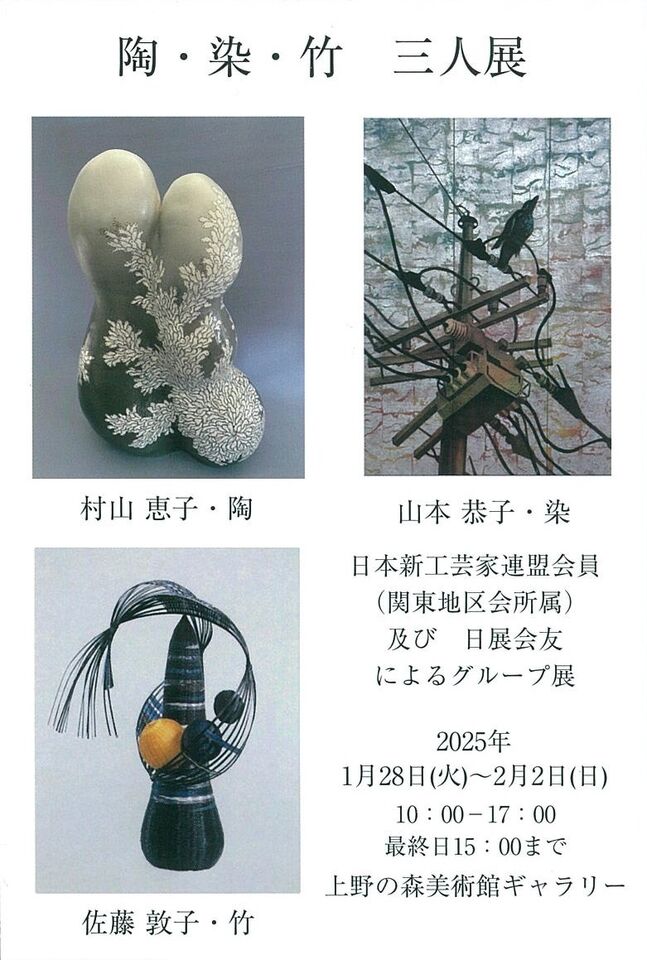 - 日本新工芸家連盟会員による陶、染、竹の、素材の違う作家3人がそれぞれの形と色を活かした作品を展示。