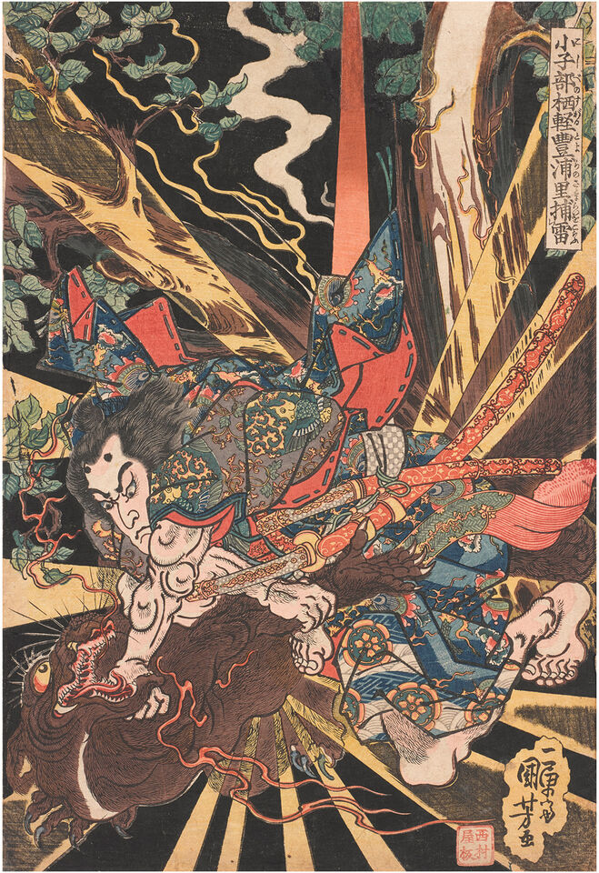 (上)歌川国芳「小子部栖軽豊浦里捕雷」