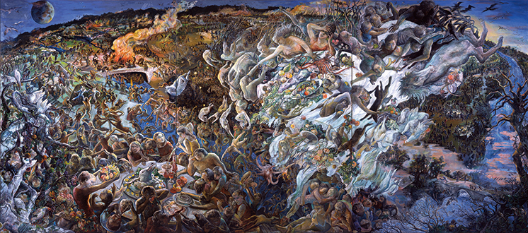 人間存在の暗い深淵に差し込む微かな光を頼りに描き上げたかのような作品群は、意識の領域も含む、世界に存在する全ての現象を封じ込めたかのような壮大な物語を築き上げています。現代を生きるひとりの表現者として、真摯に絵画と向き合う画家の「魂」をこの機会にご高覧ください。