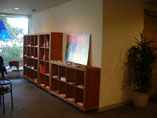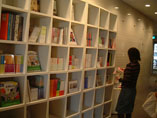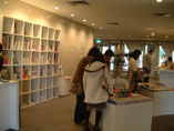 エントランスを入り受付の奥に広がる、ミュージアムショップと作家資料閲覧コーナー(喫茶店内)に注目してください。すてきな書棚が目をひきます。