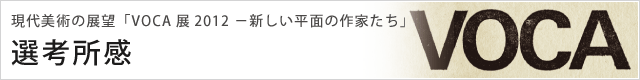 今回はこれまでのVOCA展と大同小異といっていい。が、特に気づいたことをいうと、平面(絵画)の認識が浸透して久しいせいか、各出品者は、その点を留意した作品づくりとなっている。選考にあたっては、3月11日の東日本大震災が有形無形、何らかの影響が作品に反映しているのではないかと思ってみたのだが、期待薄であった。まあ、問題が大きすぎて、あつかい得なかったのだろうと想像した。