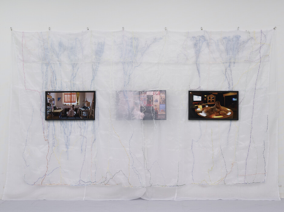 写真印刷用紙、額、ディスプレイ、半透明カーテン、刺繍糸56.4×75.2×3cm が2枚(写真)56.4×75.2×3cm(映像20分45秒)245×400×3cm (カーテン)