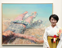 2017年4月27日(木)常陸宮・同妃両殿下ご臨席のもと、第35回上野の森美術館大賞展の授賞式がとりおこなわれました。受賞者が自作についてご説明する場面でも両殿下は、熱心に耳を傾けてご鑑賞くださいました。(写真は絵画大賞の千葉美香さん)