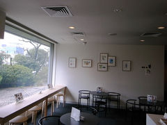 喫茶で休憩を 2014年10月28日 今日は気持ちのいい秋晴れですね。北斎展も11月の最終日を前に一旦落ち着いた感じです。それでも会場はチョット混んでいます。鑑賞中にお疲れの方は、会場内に設置している椅子や、今や北斎展名物の「北斎茶屋(*お茶はでません)」をご利用くださいね。鑑賞を終えたら(今度こそ!)お茶を飲んで休憩していただく場所がちゃんとあります。「喫茶 森」でごゆっくり。そうそう、ここにもカワイイ絵が飾ってあるのでそちらもご覧くださいね。