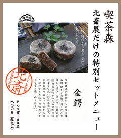 展示室には北斎茶屋が!でもやっぱり喫茶で一服。 2014年9月11日 開幕しました「ボストン美術館浮世絵名品展 北斎」。さて、観覧後にはやっぱり喫茶で ”お茶を一服” ですよね。喫茶 森では、江戸の庶民のお菓子だった「きんつば」をご用意しました。日本橋の老舗、榮太樓さんが創業当時から看板メニューにされているきんつばは、刀の「鍔(つば)」をかたどった丸型です。そして、お茶は大佐和老舗さんの美味しい濃い煎茶を添えました。庶民的なお茶セットでお楽しみ下さい。数に限りがありますので、1日限定30セットでおまちしています!