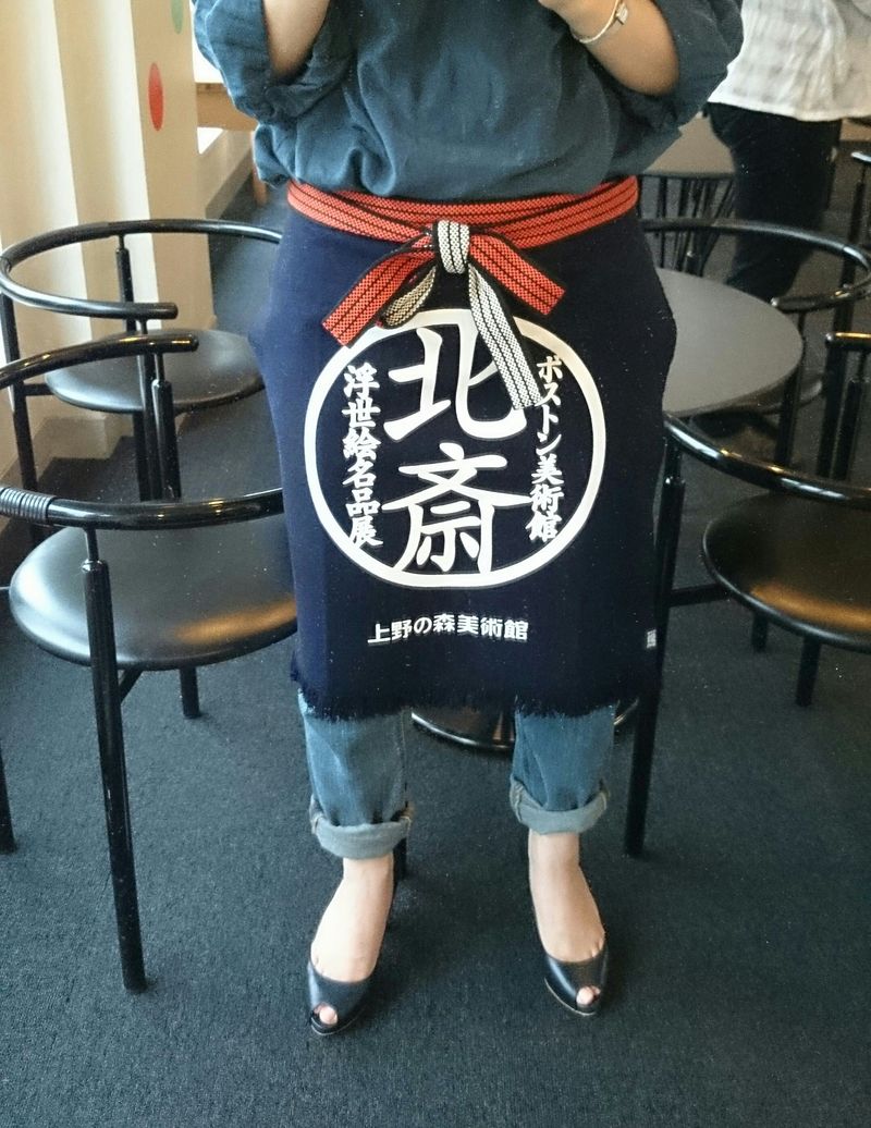ユニホームです! 2014年9月18日 展示室に、ちょっと腰かける椅子ならぬ茶屋風の椅子があります。目印は「北斎茶屋」の看板です。でも、ここではお茶はのめません。ということで、お茶なら喫茶森でどうぞ。こちら「喫茶森」の目印は 前掛けです。この前掛けでお迎えします!おすすめメニューはきんつばですよ。
