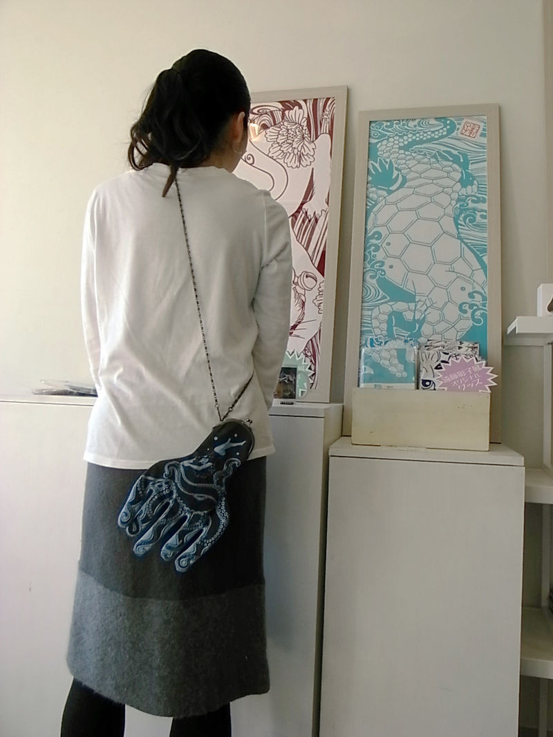 遠藤彰子展オリジナルグッズ 2014年1月19日 展覧会ではオリジナルグッズをさがすのは楽しいもの。今回は遠藤先生のオリジナルデザインのグッズがたくさんあります。タコバッグ→3,500円缶バッジ→200円手ぬぐい→1,260円ネコやらタコやらいろいろなモチーフが!お気に入りのデザインを探しにいらしてください。缶バッジの台紙を切り取るとライオンができます。お楽しみはたくさんありますね〜