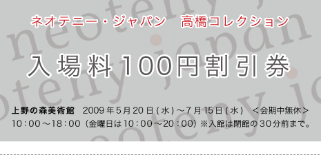*会期中、割引チケット1枚につき、一回限り1名様まで有効。 *本割引券は他の割引券との併用は出来ません。 *プリントアウトしたもの以外は使えません。 *学生の方は学生証をご提示ください。