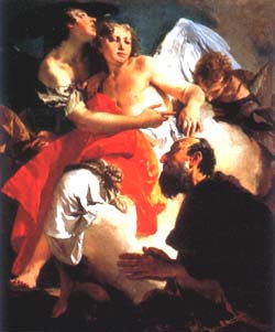 最初のユダヤの族長アブラハムが目の前に立つ3人の男を歓待したことで、3人の天使がアブラハムの年老いた妻に子供が授かると予言したとされる旧約聖書『創世記』の話を描いたものである。描かれた人物のうつろな眼差しがティエポロの特徴といえる作品。