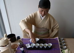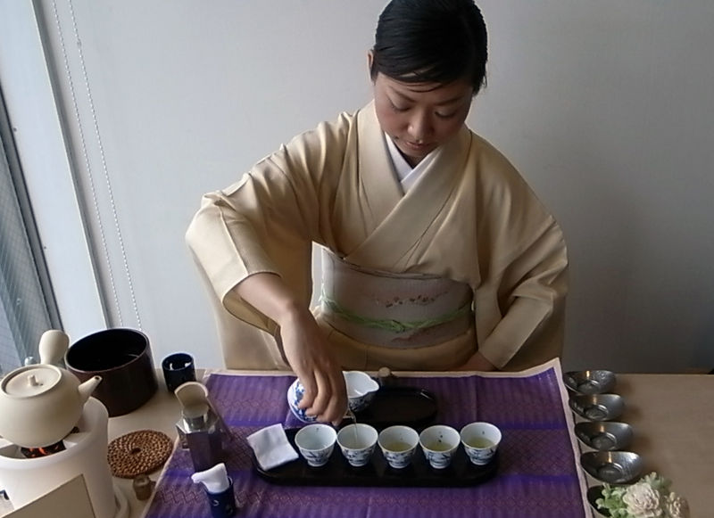 今回は展覧会の関連企画として、小笠原流煎茶道のお点前を立礼式で体験していただいています。