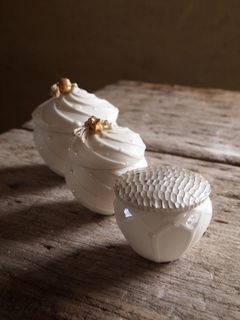 こちらは陶器で、少し大きめにつくっています。キャンディーを沢山入れるも良し。
