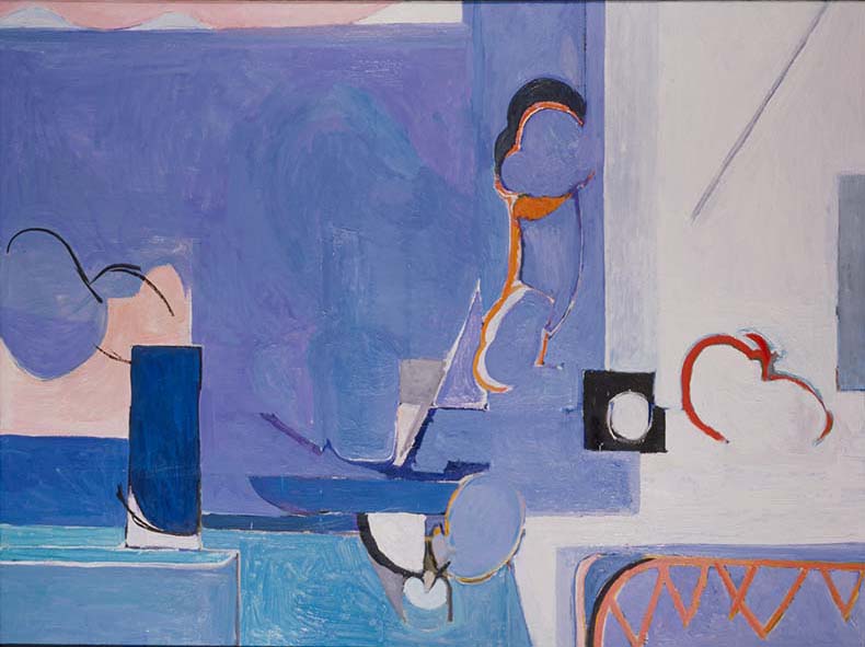 窓のある壁の前に植木鉢やビン、カップなどを並べて描いた絵ですが、できるだけシンプルに描こうとするうちに、ビンは消えてしまったそうです。中央に、かすかにシルエットが残っていますね。マティスを思わせるようなブルーの色面が印象的で、モチーフは室内の静物であるのに、海や空を背景にしているような気持ちのよい空間がひろがります。