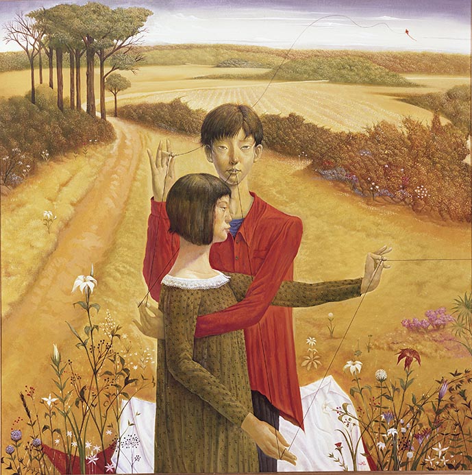男性が女性を腕で抱え、二人はあやとりのようにつまむ黒い糸で結びついているように見えます。しかし二人はバラバラな方向を向いて、異なる思いを抱えています。タイトルの「HITORI」には、人間関係の難しさが込められています。硬質な人物描写、緻密な草花の描写は北方ルネサンス様式に倣っています。