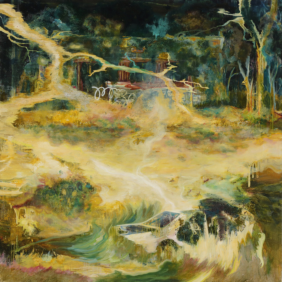 これは現実の風景ではなく、画家の頭のなかに浮かぶイメージを絵にしたものです。奥には廃屋が覗き、手前には車が棄てられ、勢いよく生える草に飲み込まれそうです。雷が落ちて、稲妻が木の枝や地面を走る。一見破壊的な光景のようでいて、むしろ「忘れ去られた」廃墟が新しいものに生まれ変わる強い生命力や予感を感じさせます。