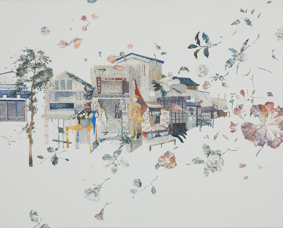 大胆な余白を生かした、繊細で軽やかな描写で、浅草の風景の記憶を視覚化した作品です。画面全体に草花が散りばめられ、それが動きと空間の奥行きを作る効果と生んでいます。