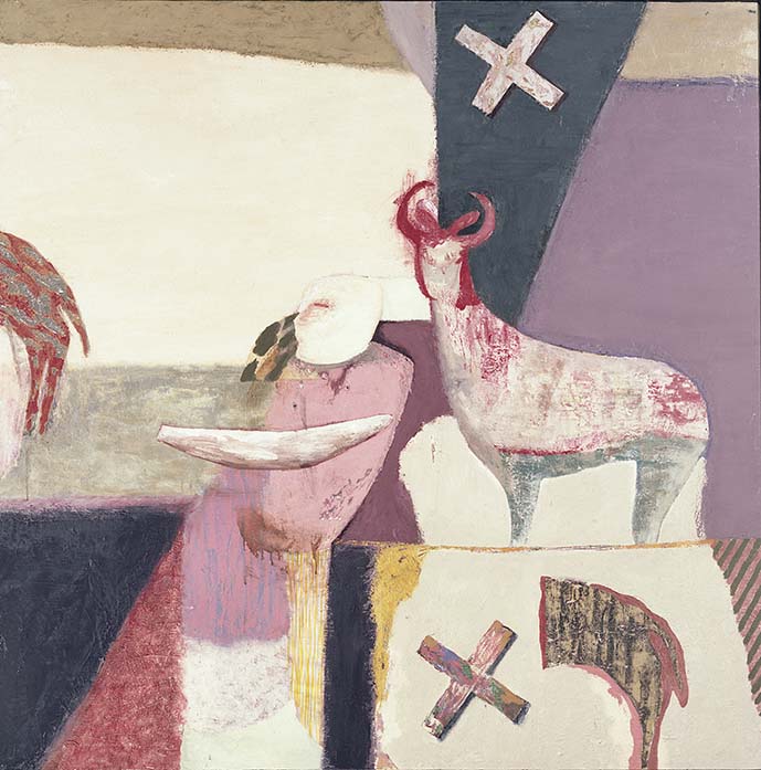 当時、芸大の学生だった作家は、絵画を含めた現代文化に共通する問題を「人間中心主義を超克すること」と捉え、文化人類学的な視点を導入することで新しい絵画への突破口を見出そうとしていました。その結果、モダンな色彩と構図の裂け目から突如動物が現れ、人と動物が共存する儀式的な空間と、潜在していた記憶を誘発するようなイメージが生まれました。