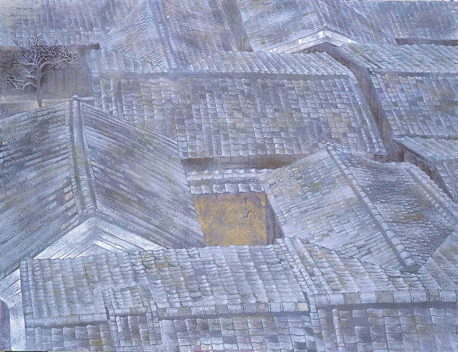上から見下ろす斬新な構図と、画面いっぱいに連なる甍(いらか)。画材である岩絵具が、瓦や土塀の質感とぴったり合って、手触りまで伝わってきそうです。奈良の古い歴史が残る町に住み、こうした瓦屋根を生活のなかでいつも目にしているからこそ描ける絵なのでしょう。