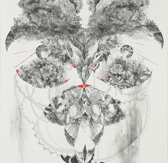 草花や虫などの生命のエネルギーを緻密に描いています。左右対称の構図が求心的画面を作り、真正面から見た人間の身体を意識させます。モノクロ画面の中でアクセントともなっている赤は、血液や生殖的なテーマを連想させ、生命の象徴でもあります。痛みや哀しみの記憶を草花や虫などの生命に置き換えて表現しています。