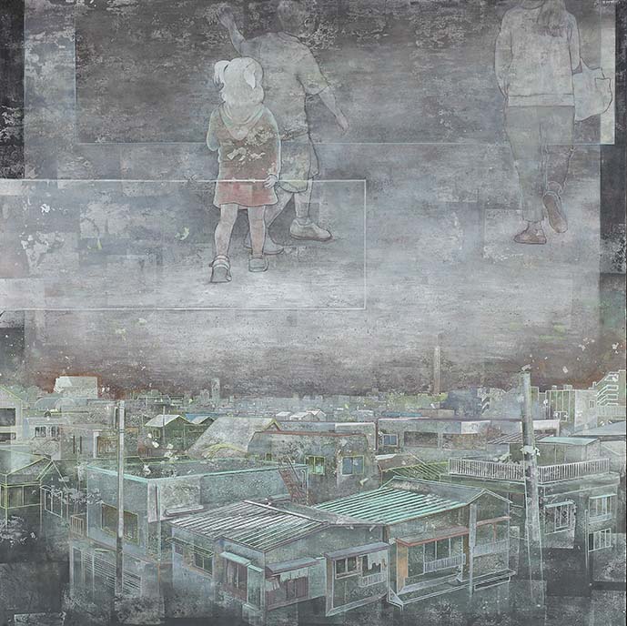 上半分では母子三人と思われる後ろ姿と、下半分では家々が連なっている情景に、どこか見たことのある懐かしい場所や時間を想起させます。