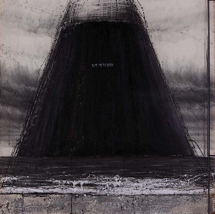画家は瀬戸内海の因島で生まれ、巨大なタンカーやコンテナ船を造る造船所を見て育ちました。ここに描かれた迫力のある「塔」は特定の建築物ではなく、巨大な建造物を見続けた作家の記憶の中から生まれた象徴的なイメージです。画面から飛び出すような下の波と浜辺は、厚く盛り上げられて、巨大な塔を支えています。