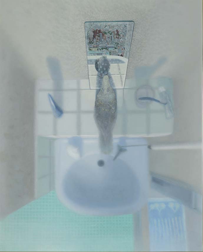 「日常」に潜む「非日常」、それを強調するように、クリアに描かれた鳥とは対象にその周辺はぼんやりとして、現実の不確かさをほのめかしているようです。