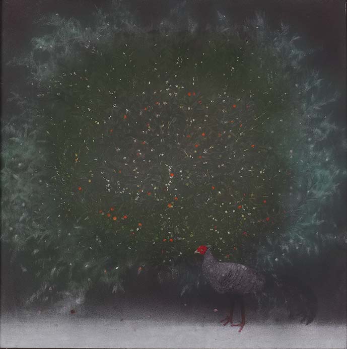 赤く実をつけたフユサンゴはひときわ大きく描かれ、シマハッカンにひとときの安らぎを与えているようです。