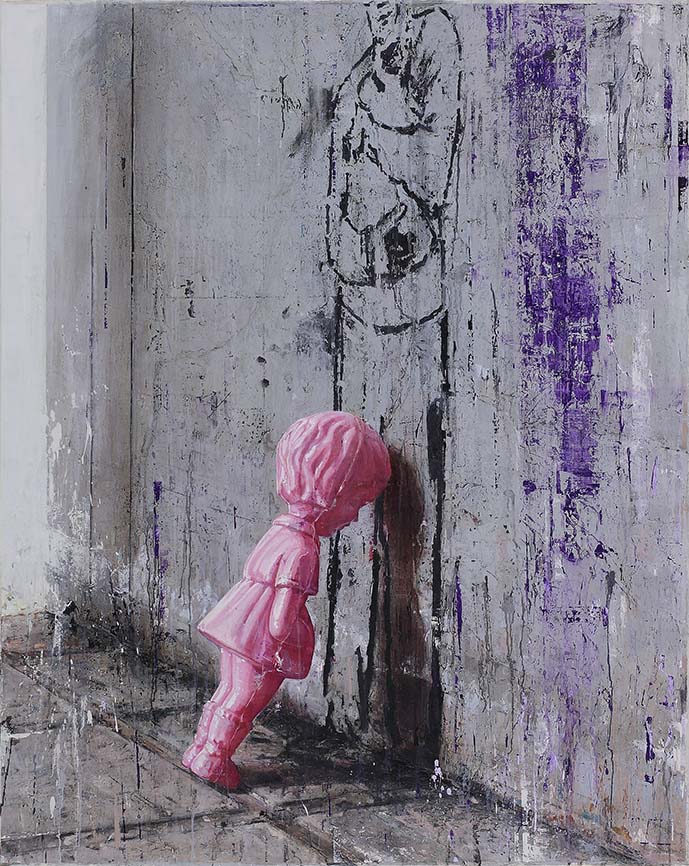 人形が立てかけられた壁には、幼子を抱く父親が描かれています。見る側には、人形が壁の親子に甘えているように映りますが、そのうちに人形と壁との「距離」に気づくと、物悲しい雰囲気を感じます。
