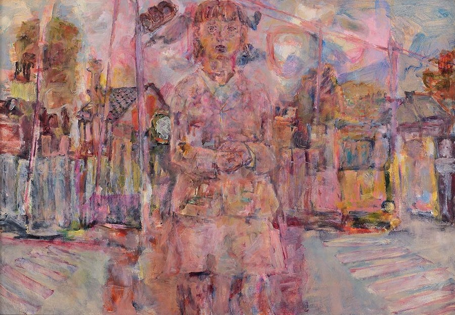 淡く暖かな色合いの街並みは、ノスタルジックな雰囲気で哀愁を誘います。しかし、中央に佇む女性は輪郭がぼんやりとして、今にも背景に溶けてしまいそうです。
