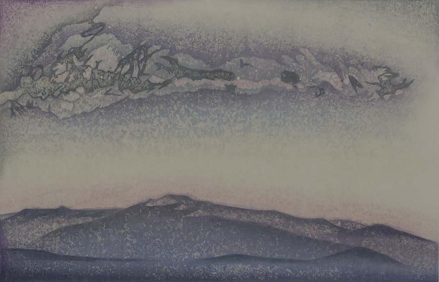 四国の石鎚山脈を海岸から見た風景です。山脈はなだらかに横に広がり、その上には山脈をなぞるように星雲が広がっています。夕方から夜の帳が下りる頃の情景を、淡い繊細な色合いで表現した木版画です。