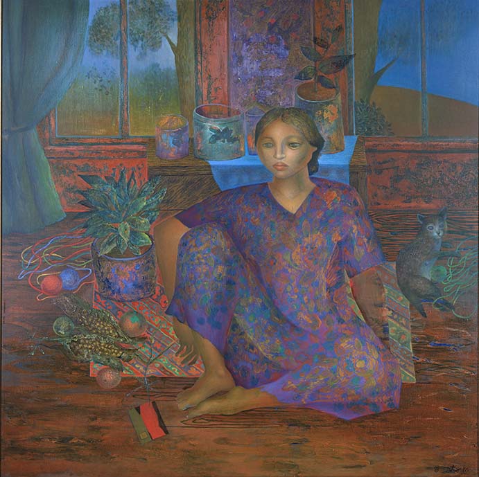 窓から外が見える室内の情景。窓のある壁と床が平面的につながっている様子はマティスを、ふっくらとした女性はルノワールやマイヨールを彷彿とさせます。さらに床に座る女性のポーズやカラフルな色彩はマティスやルノワールを魅了したオリエンタリズムを思い起こさせます。西洋絵画の過去の巨匠達から引用して描かれた作品です。