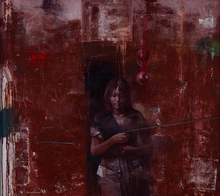 布やダンボールが貼られた非現実的な空間に女性が佇んでいます。その表情は曖昧で読み取れず、画面外のどこかへつながる紐や落下するりんごなど、謎は深まるばかりです。