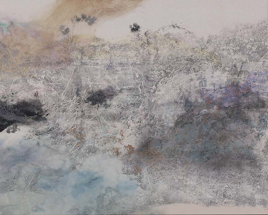 画面全体に施された微細な点描によってスプレー菊の陰影を表し、輪郭のない不確かな存在として、生命の一瞬の美しさを捉えています。
